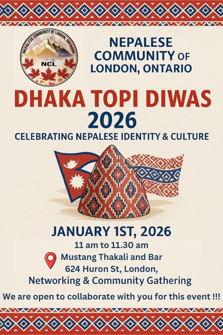 We are excited to announce that the Nepalese Community of London, Ontario will be celebrating Dhaka Topi Diwas 2026 – a special occasion to honor and showcase our rich Nepalese identity and culture.