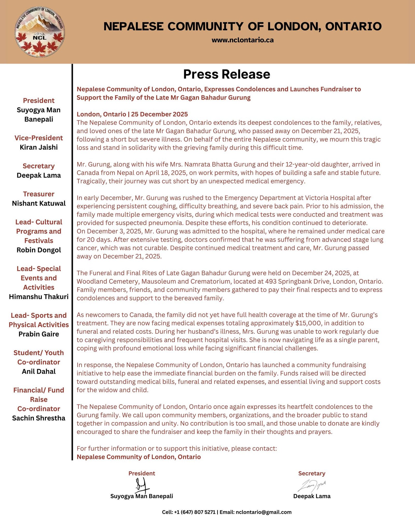 Once again, thank you for standing together and supporting the Gurung family during this time of loss. This collective effort truly reflects the compassion, unity, and strength of our community.